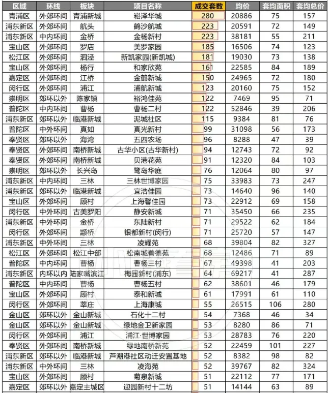 这些小区分布在浦东、宝山、青浦、松江、嘉定等区域,环线以外郊环间为主力,但也有不少中内环间的“小面积低总价”房源持续成交
