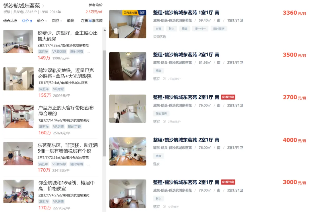 ·鹤沙航城(浦东外郊环间):套均总价约150万元,月租金约3000元,年租金3.6万元,租售比约 2.4%