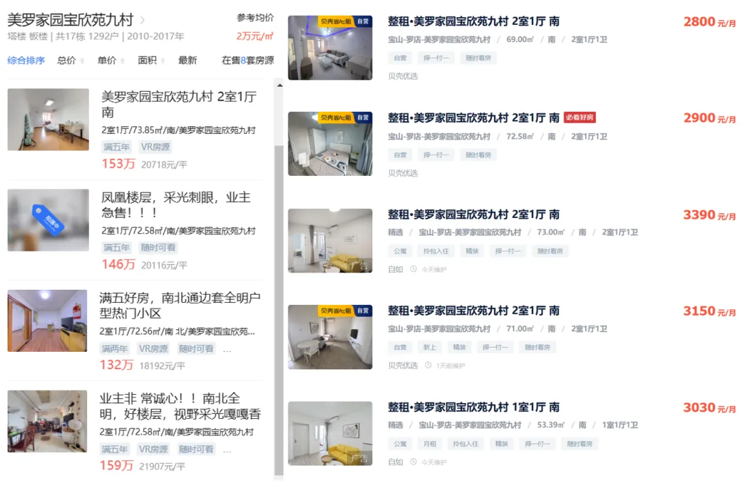 · 美罗家园(宝山外郊环间):套均总价约140万元,月租金约2800元,年租金3.36万元,租售比约 2.4%