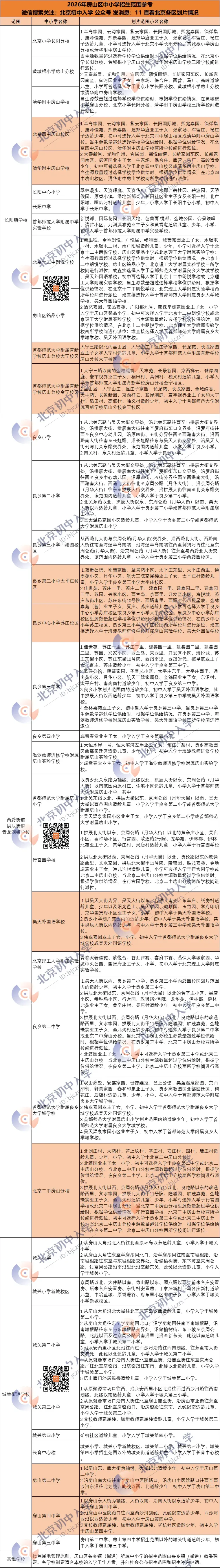 2026年在房山区小升初的家长们注意!咱家房子所在小区具体能上哪所小学和初中呢?北京初中入学(ID:bjczrx)为家长们分享2025年小学初中划片范围,家长们可做参考,还是以当年最新发布消息为准!2026年北京小升初政策在4月中下旬发布,请持续关注北京初中入学公众号,一有新消息,会第一时间同步给大家。也欢迎大家把公众号名片,推荐+安利给其他家长朋友。