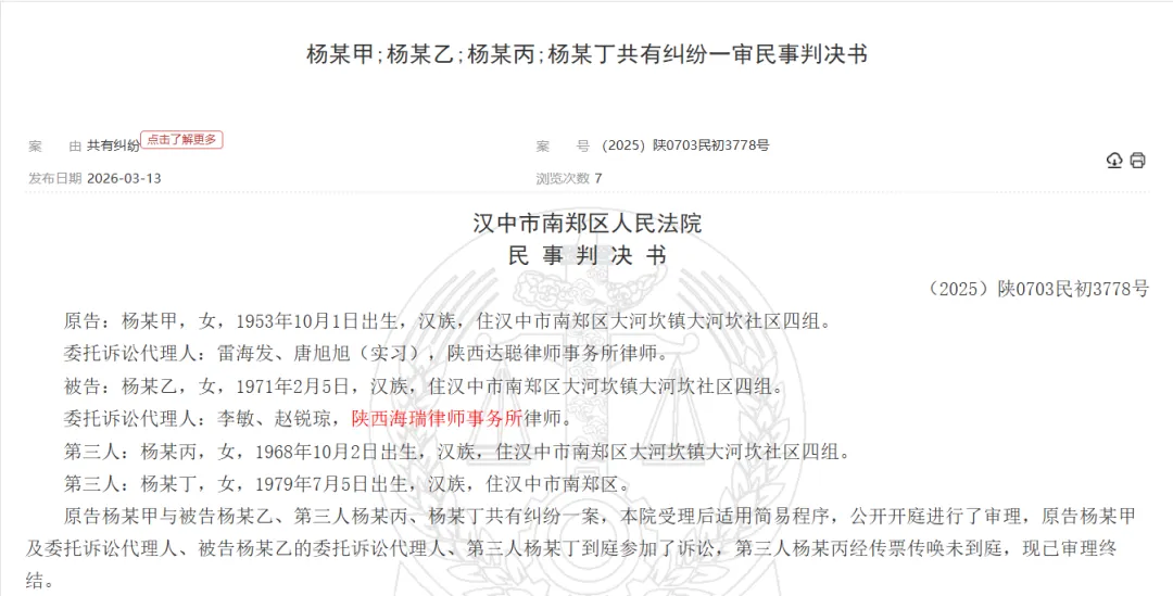 汉中市南郑区人民法院经审理,完全采纳海瑞律师的代理意见,依法作出判决:驳回原告杨某甲的全部诉讼请求,案件受理费由原告承担。至此,这场房产纠纷圆满落幕,杨某乙的合法产权得到法律的有力保护。