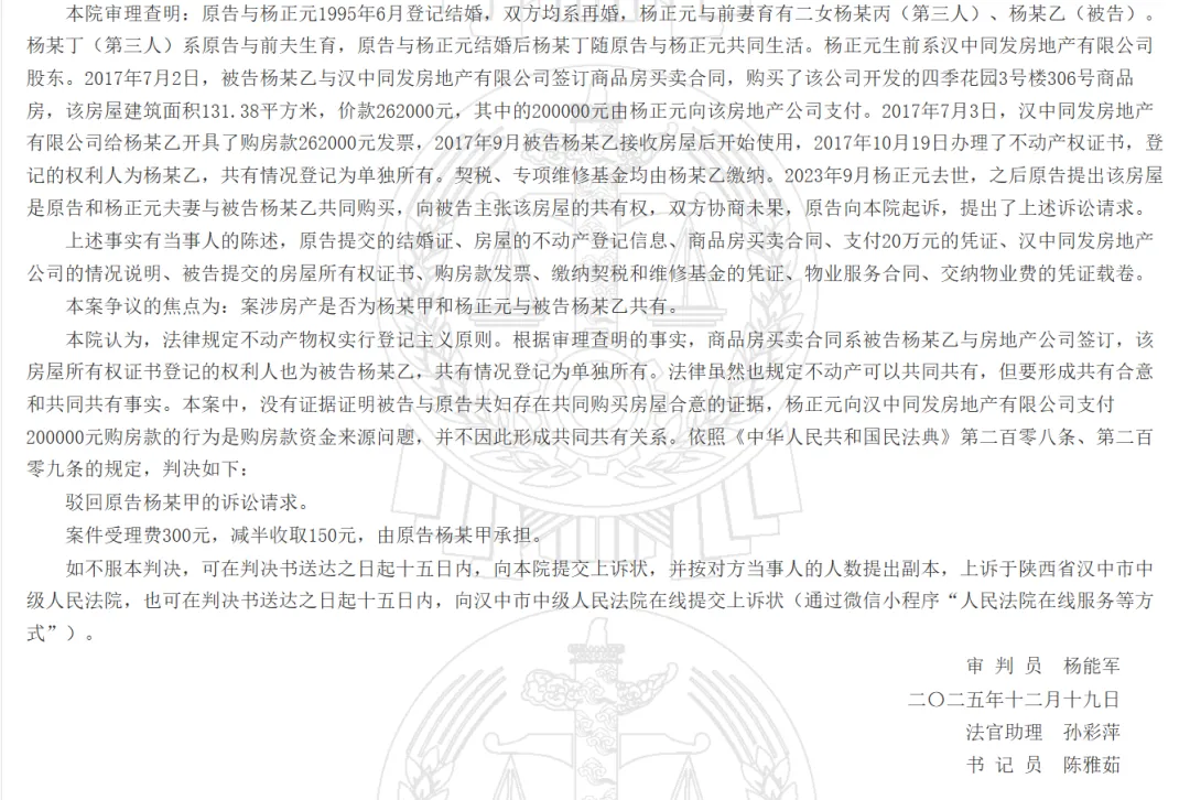 2017 年,杨某乙因子女婚嫁需要购置房产,依托亲属杨正元的股东身份获取内部优惠价,与汉中同发房地产有限公司签订购房合同,全额缴纳房款、契税及专项维修基金,并于同年 10 月办理不动产权证书,明确登记为单独所有,此后长期占有使用该房屋,一切手续合法合规。