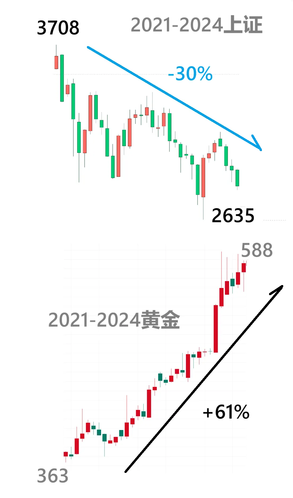 如上图,2021-2024年间股市与黄金就是背道而驰的