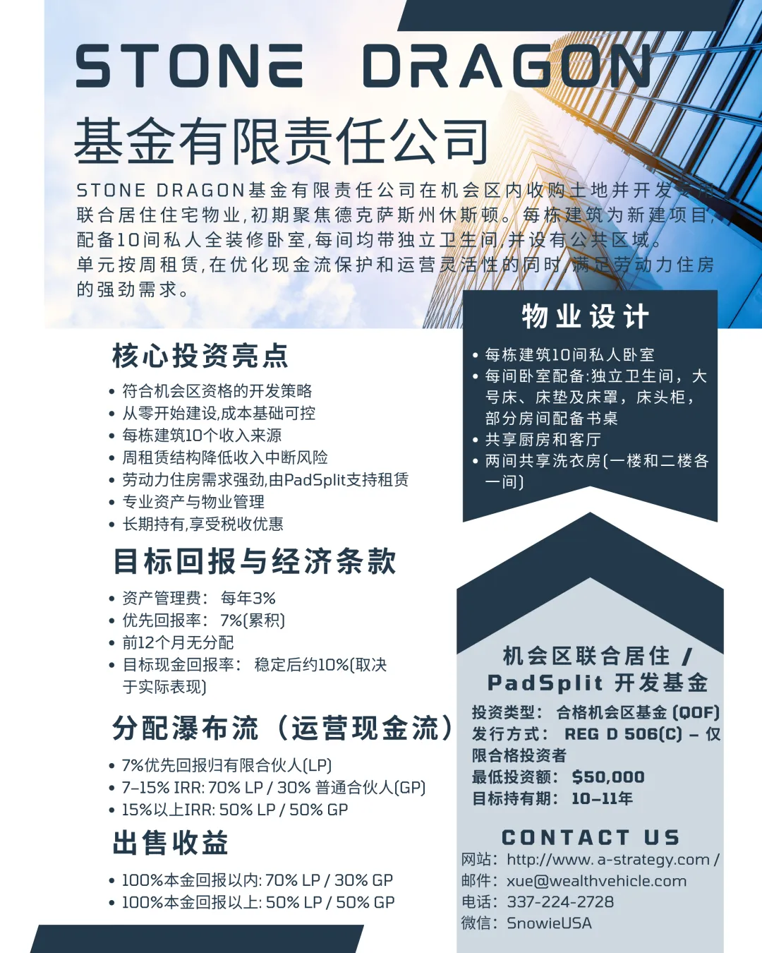 Stone Dragon基金有限责任公司在机会区内收购土地并开发专用联合居住住宅物业,初期聚焦德克萨斯州休斯顿。每栋建筑为新建项目,配备10间私人全装修卧室,每间均带独立卫生间,并设有公共区域。