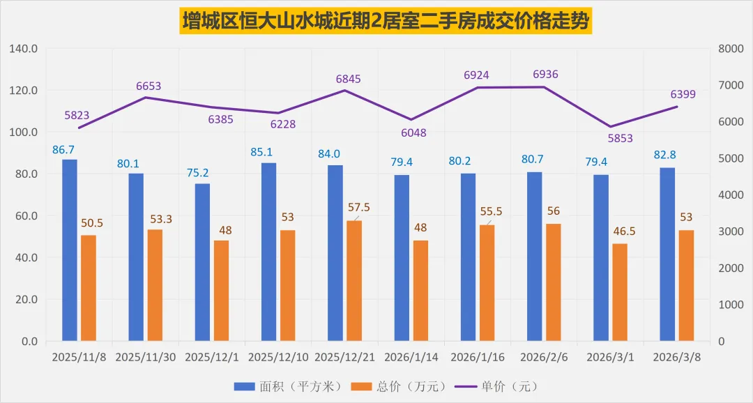 恒大山水城近期成交的10套2居室二手房,平均面积81.4平米,平均总价52.1万元,平均单价6407元/平米。
