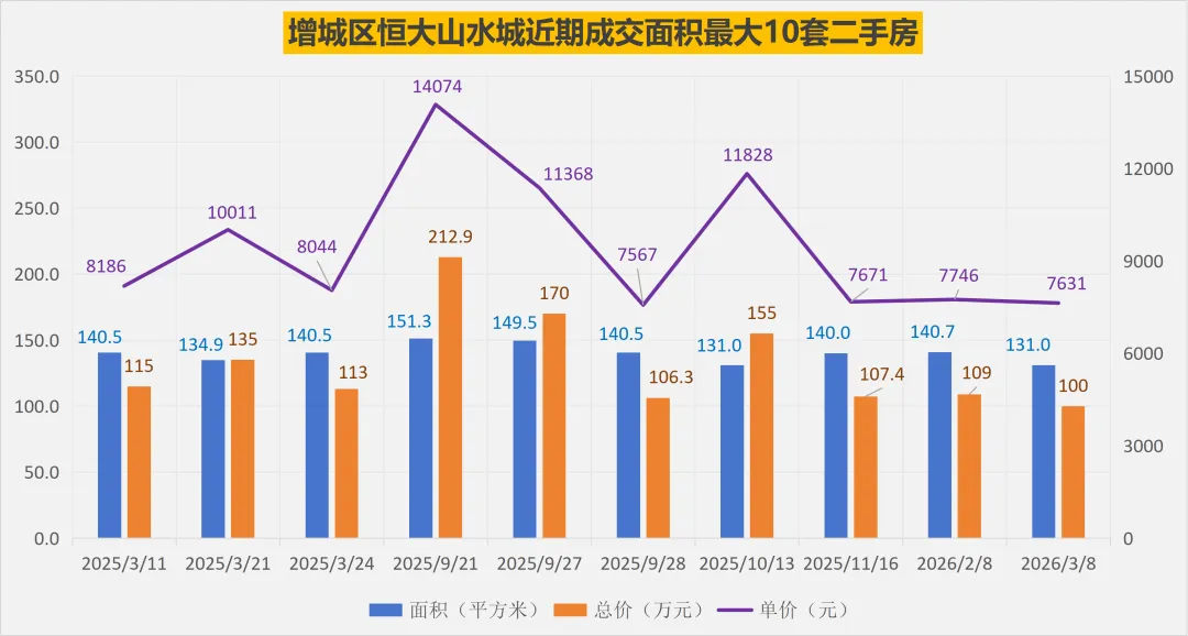 恒大山水城近期成交面积比较大的10套二手房,平均面积140.0平米,平均总价132.4万元,平均单价9455元/平米。