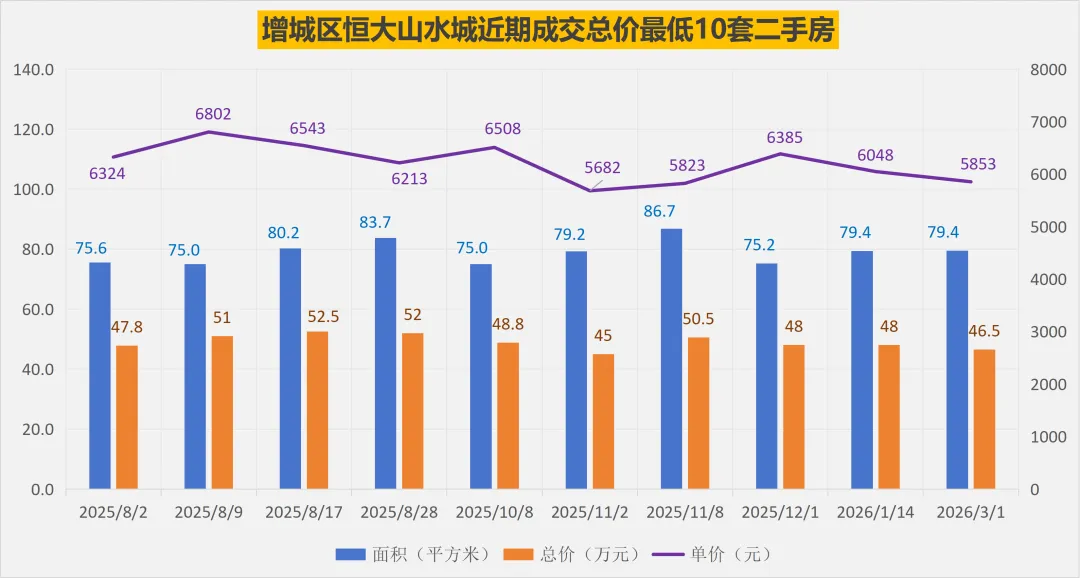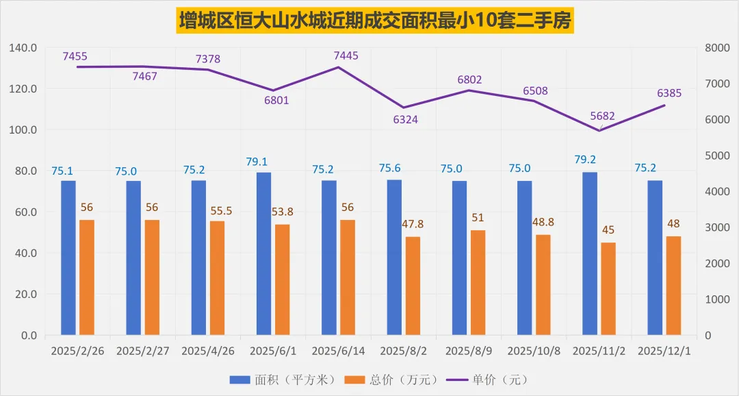 恒大山水城近期成交面积比较小的10套二手房,平均面积76.0平米,平均总价51.8万元,平均单价6818元/平米。