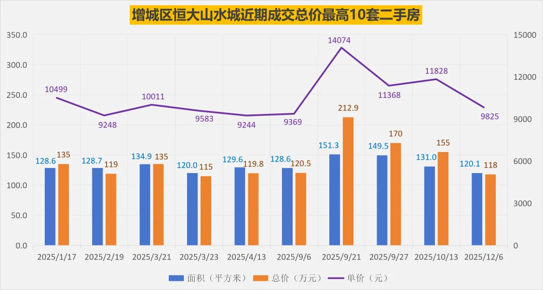 恒大山水城近期成交单价比较高的10套二手房,平均面积124.9平米,平均总价135.4万元,平均单价10840元/平米。