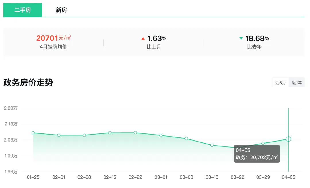 政务区4月二手房挂牌均价20701元/m²,环比上涨1.63%,同比去年下跌18.68%。