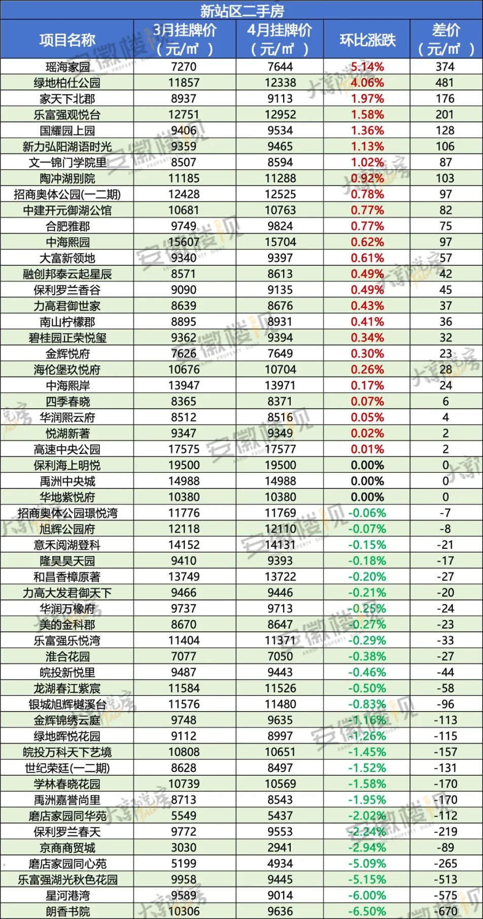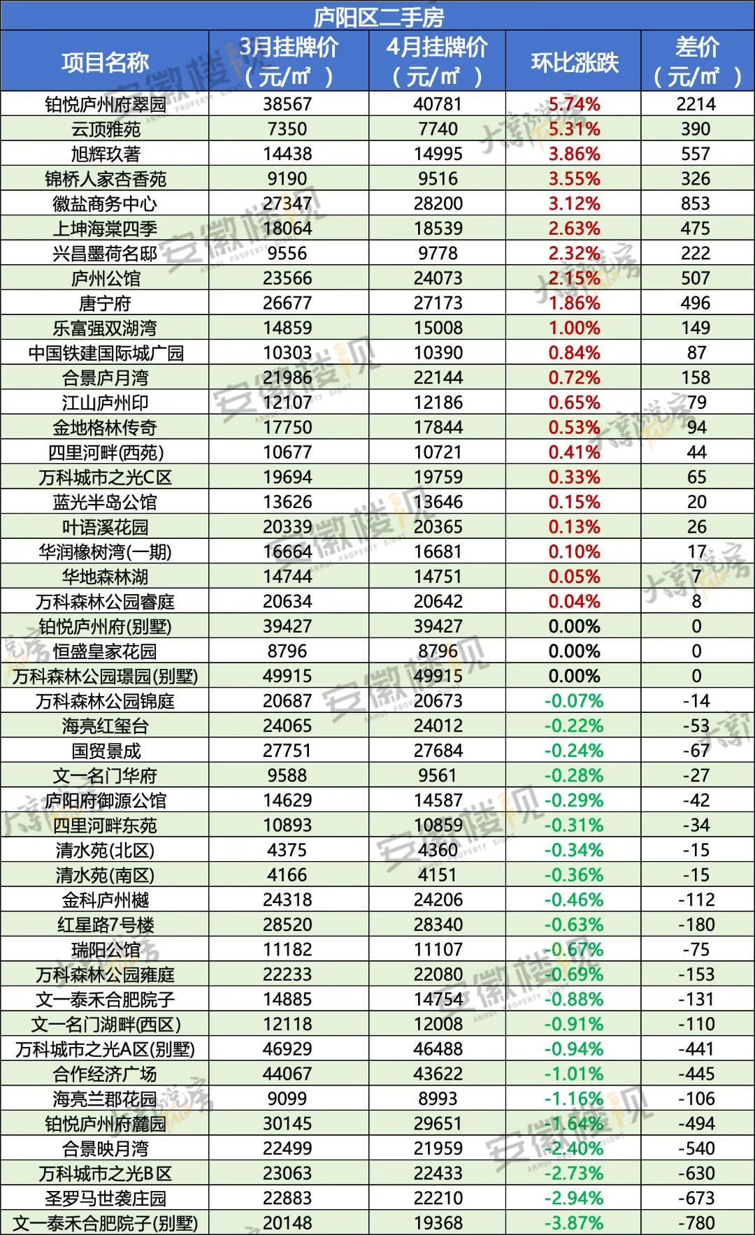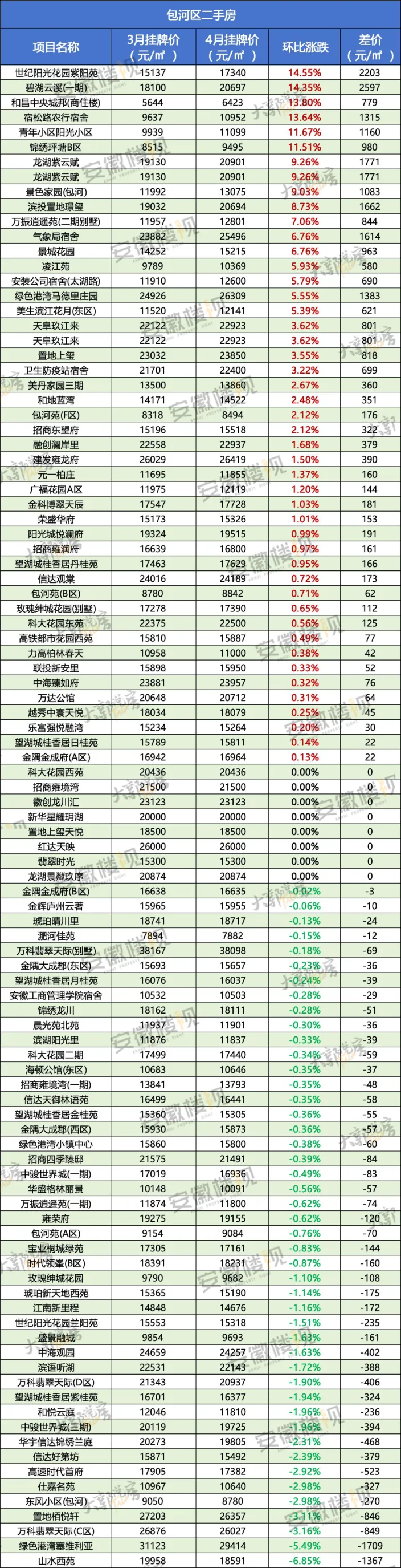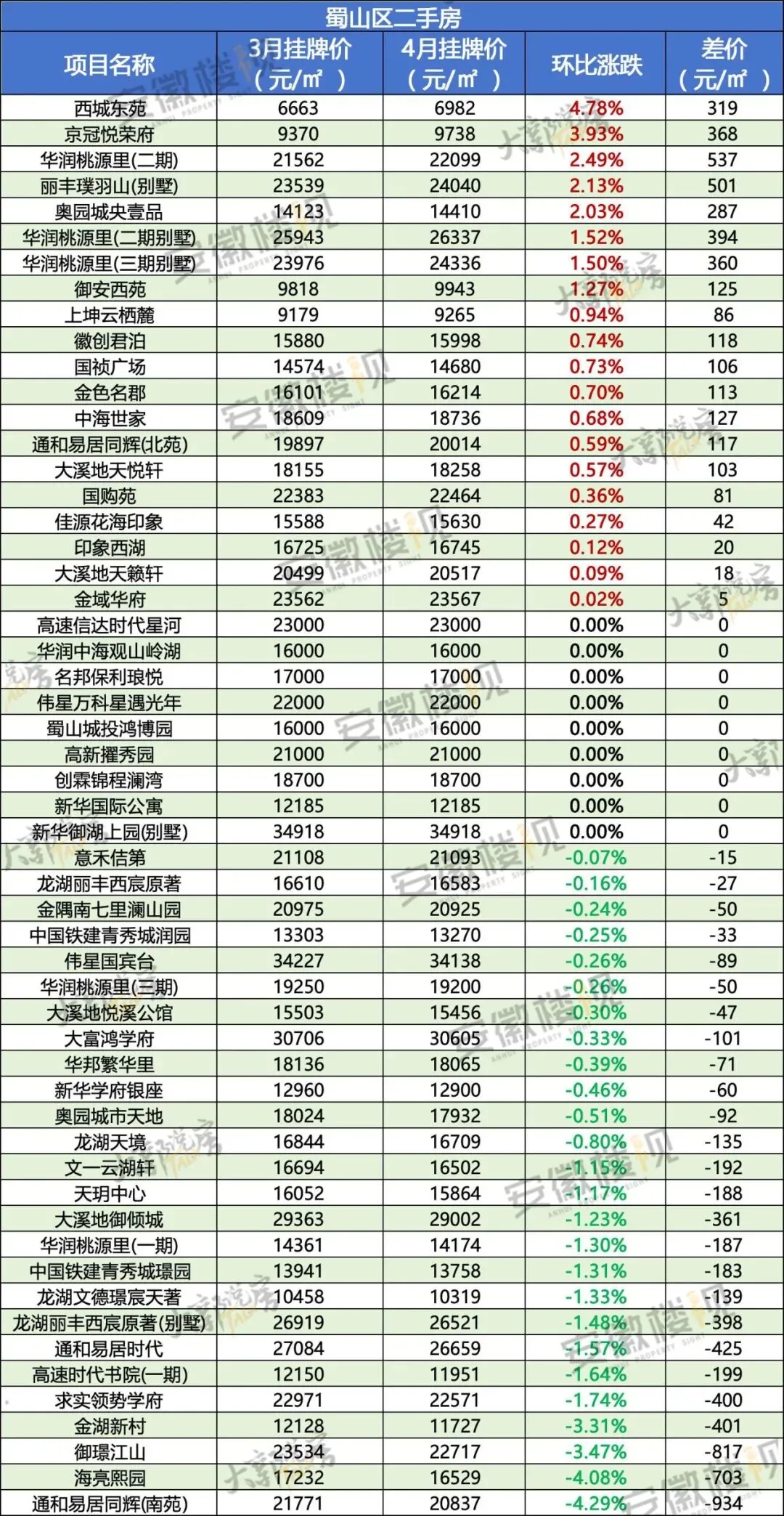 那么,在经历过3月热销,清明假期冷静后,合肥各区二手房最新挂牌价情况如何?安徽楼视统计了合肥9区的超500个小区(大多为房龄为15年以内的房源)的价格涨跌,仅供置业参考。