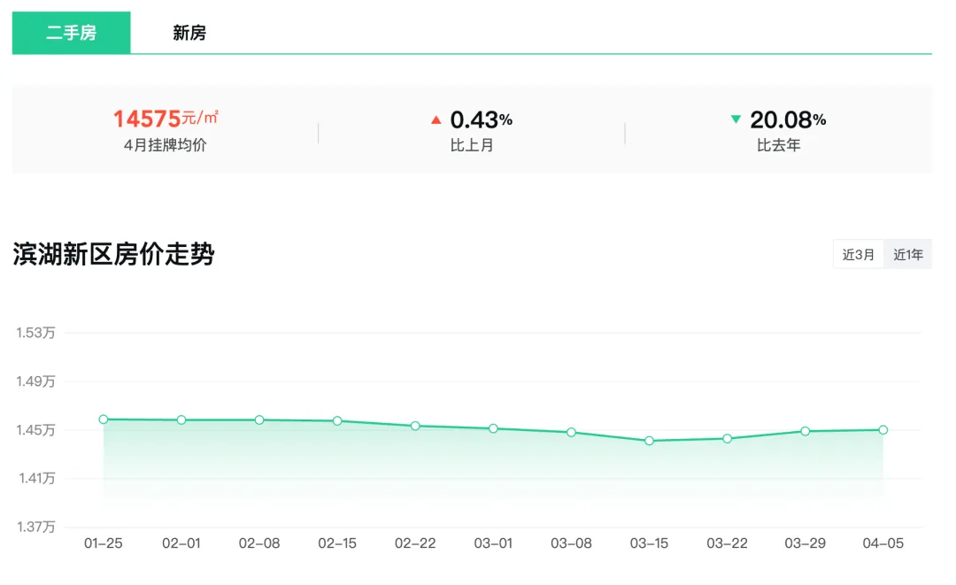滨湖区4月二手房挂牌均价14575元/m²,环比上涨0.43%,同比去年下跌20.08%。
