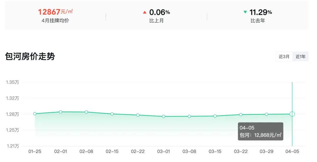 包河区4月二手房挂牌均价12867元/m²,环比上涨0.06%,同比去年下跌11.29%。