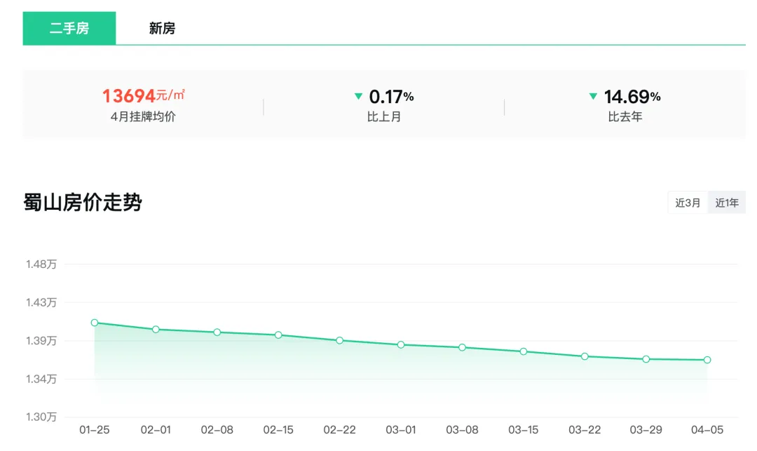 蜀山区4月二手房挂牌均价13694元/m²,环比下跌0.17%,同比去年下跌14.69%。