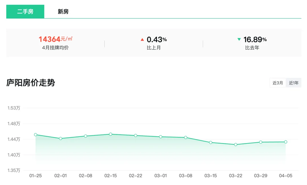 庐阳区4月二手房挂牌均价14364元/m²,环比上涨0.43%,同比去年下跌16.89%。