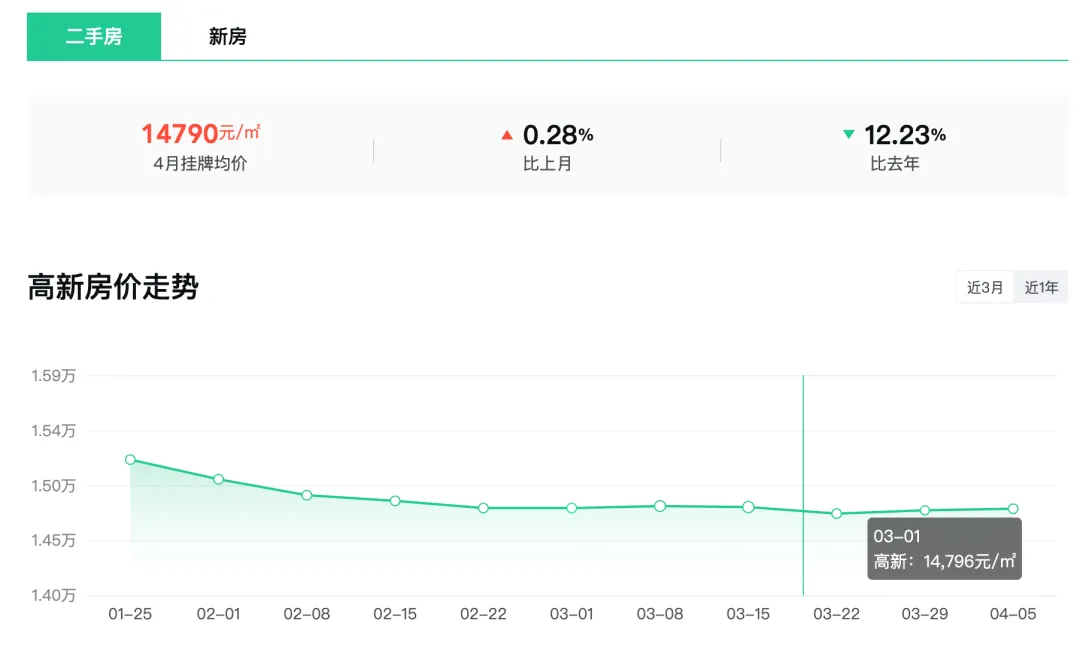 高新区4月二手房挂牌均价14790元/m²,环比上涨0.28%,同比去年下跌12.23%。