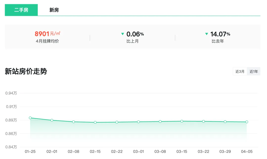 新站区4月二手房挂牌均价8901元/m²,环比下跌0.06%,同比去年下跌14.07%。