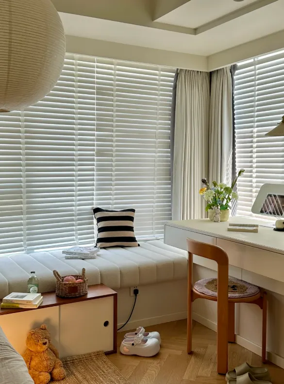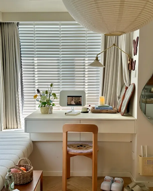 飘窗的拐角大窗户,是很少有的。直接改成书桌和休闲区,与书桌一体。在这里她可以坐在大大的书桌面前学习和工作。还同时兼顾为化妆护肤的地方,坐在这里撸个美妆,出门和朋友去打卡网红点,就是这张桌子的功劳了。