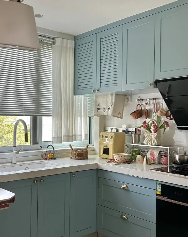 蓝色的橱柜门,浅色的台面,放上自己喜欢的烘培家电的家居,简单的搭配,生活的烟火气就出来了。不是摆设的厨房,才叫厨房。