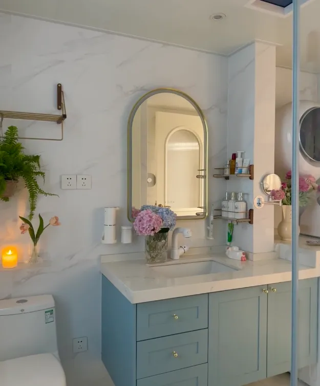 卫生间也是橱柜一样的色系,同款定制。巧妙的利用了拐角处,台面平整好做卫生。柜体可以储藏卫生用品。墙上的绿植,也给卫生间增添了一丝春天的绿意。