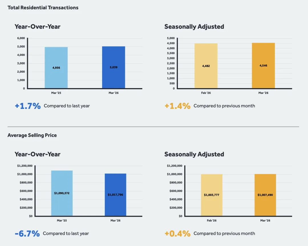 2026 年 3 月,MLS® 房屋价格指数 (MLS® HPI) 综合基准同比下降 7.4%。平均售价为 1,017,796 加元,比 2025 年 3 月下降 6.7%。