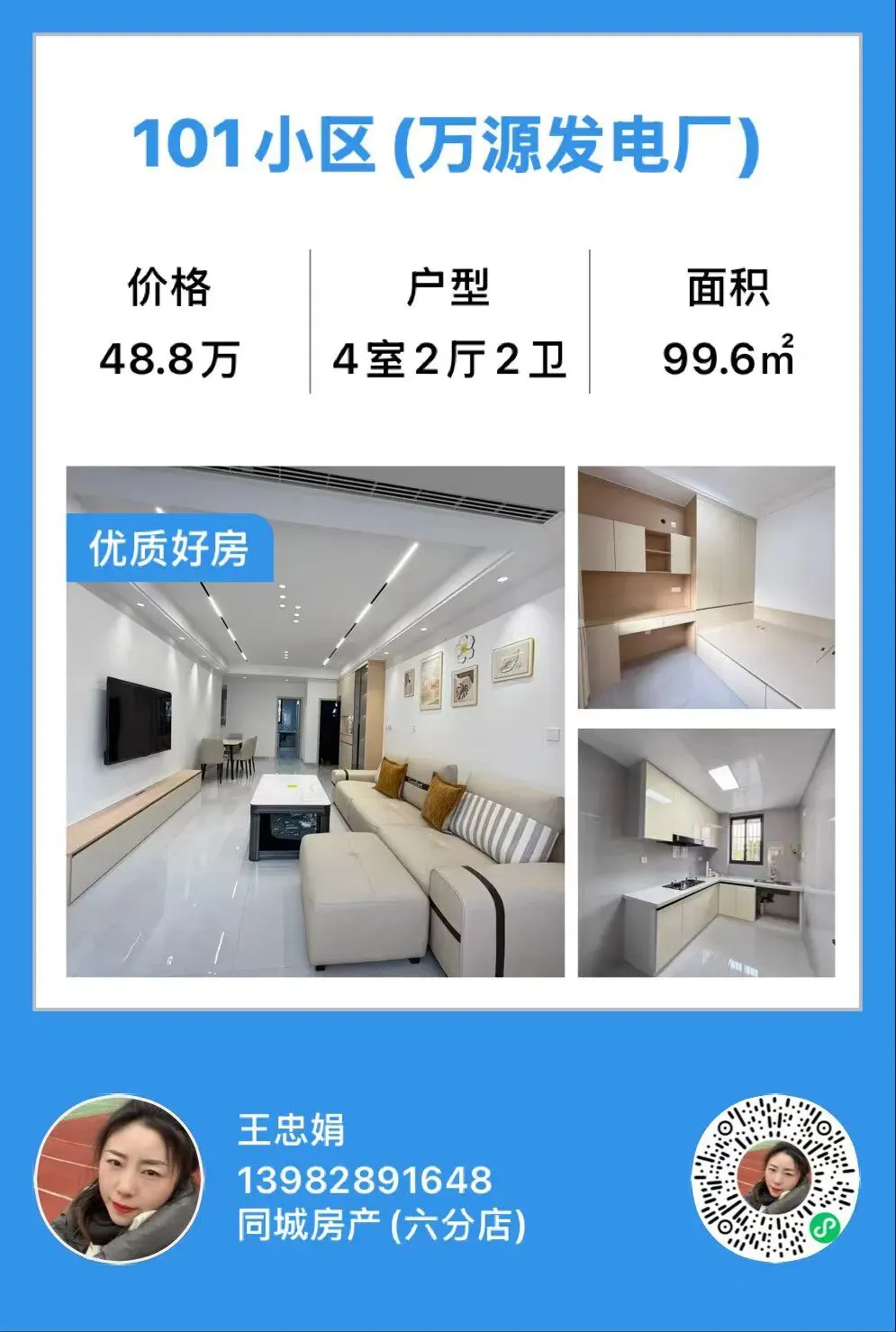 【万源房产】101小区,4室2厅2卫,总价48.8万,家具家电齐全.