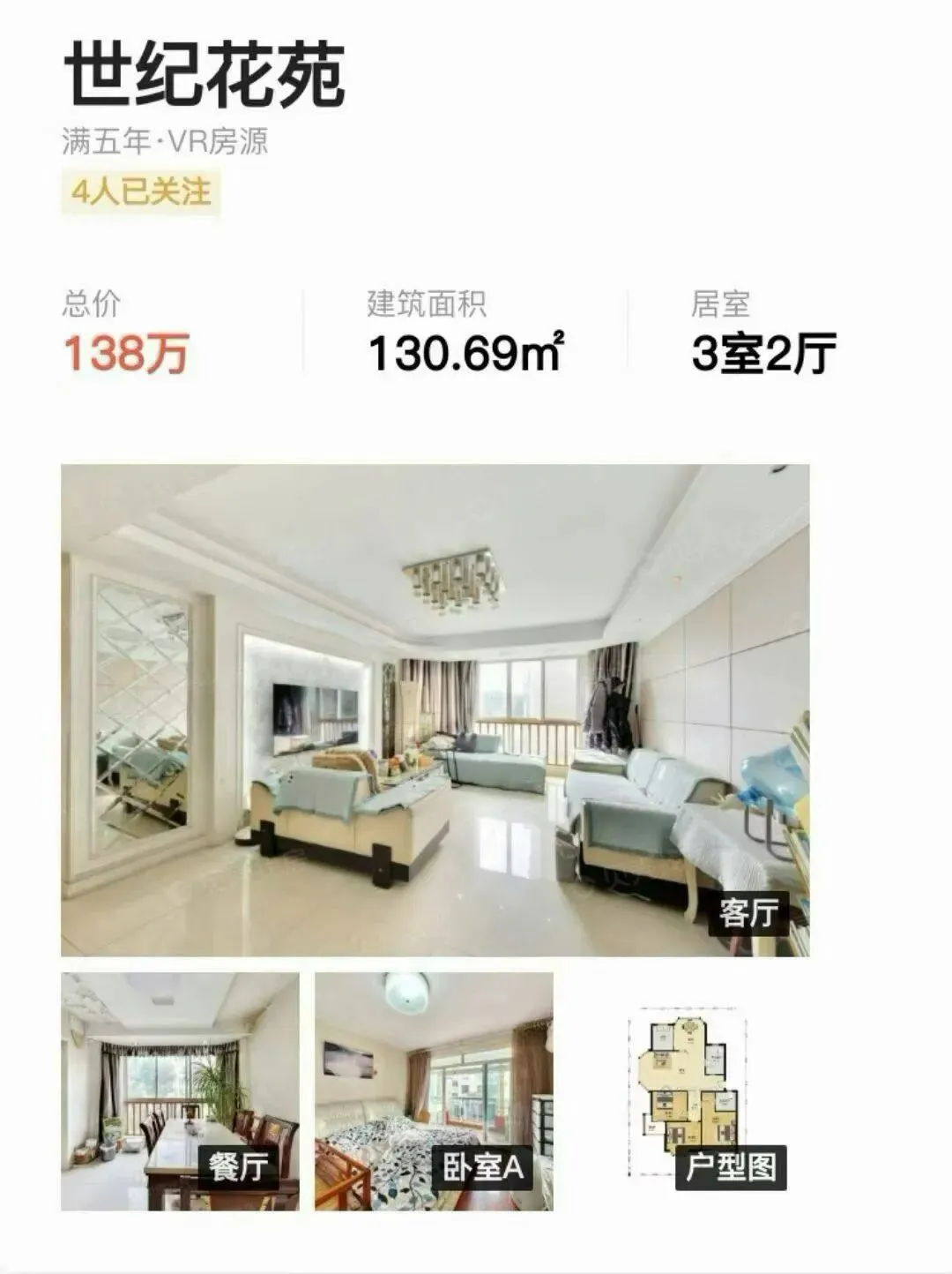 5.【和谐人家家苑】126平,三开间朝南,黄金楼层,322户型,精装修保养好,💰135万,🈵2年,不占学位