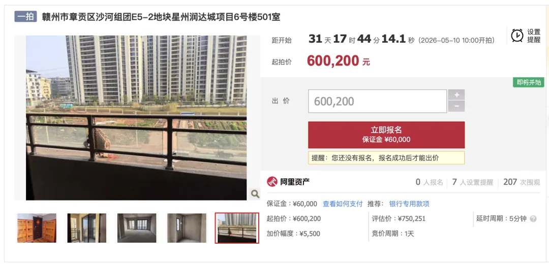 房源评估价为 75.02 万,起拍总价为 60.02 万,起拍单价 5230 元/㎡,将于 5 月 10 日上午十点开拍,暂时还无人报名。