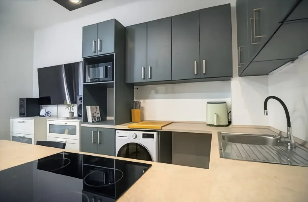 - - 内置炉灶、抽油烟机、洗衣干衣机、微波炉、双开门冰箱