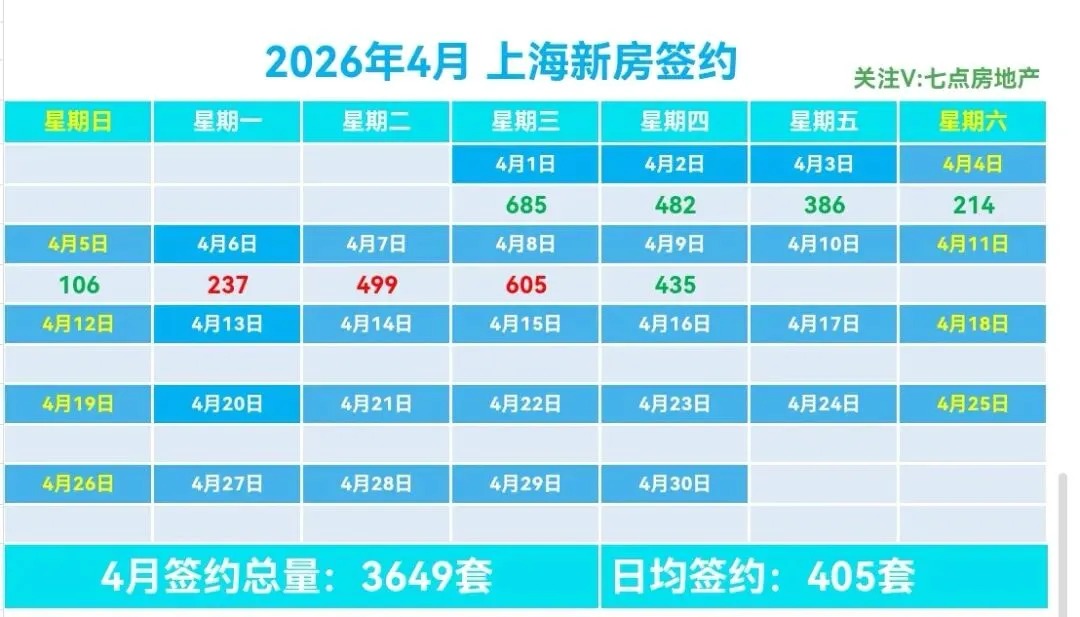 🏠4月上海新房总签约3649套,日均签约405套,本月签约总面积29.99万m²,套均面积79.73m²。