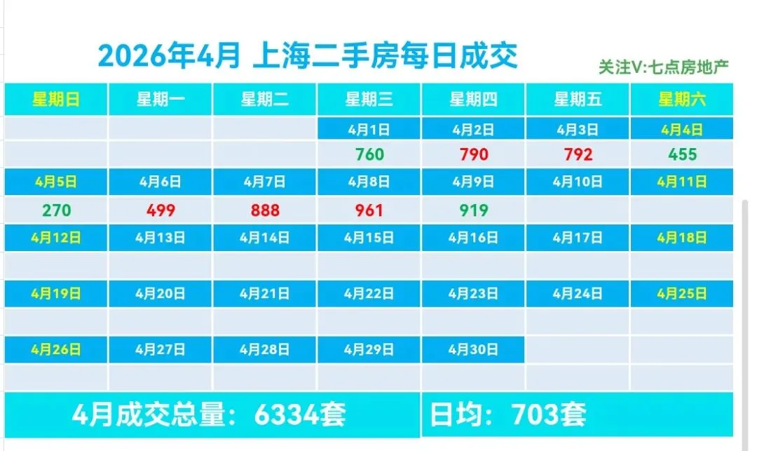 🏡4月,上海二手房成交量累计6334套,日均成交703套,较上个月日均减少303套(降幅30.12%)。