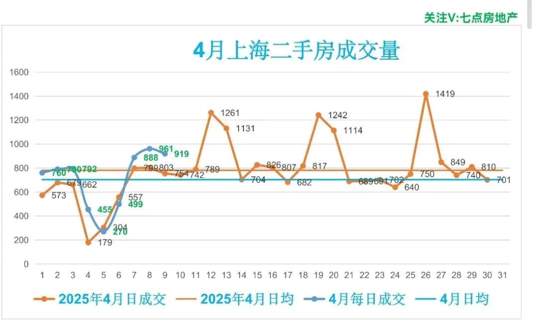 🏡昨日(4月9日,周四),上海二手房成交919套,较前一日减少42套(降幅4.37%),成交面积74912.8m²,套均面积81.52m²。