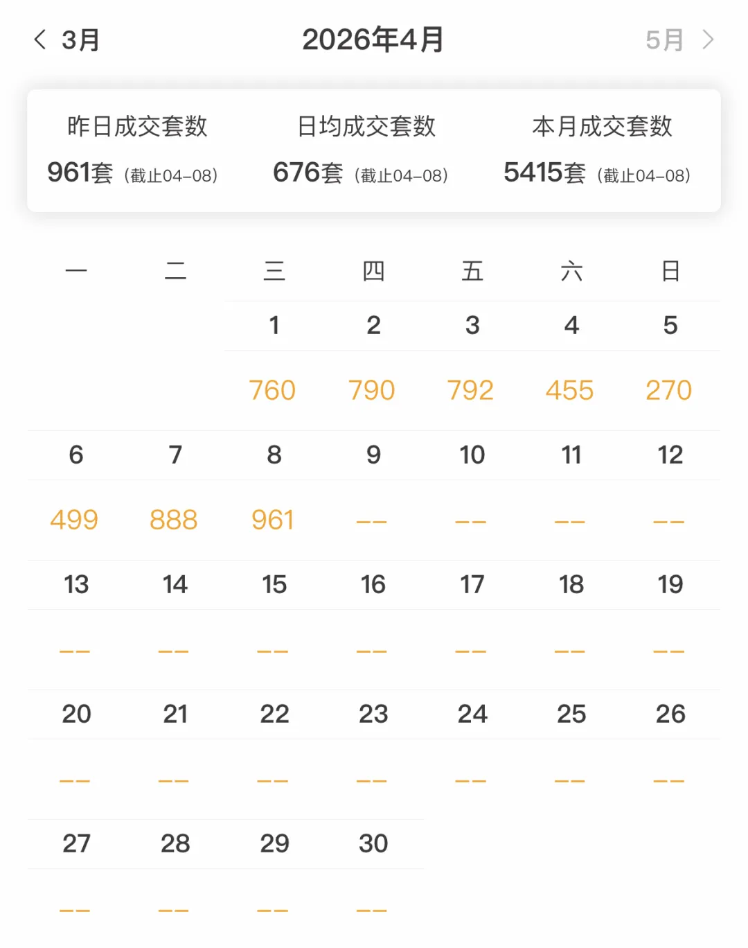 截止至4月9日,工作日单日成交760–792套,同比增加16%~+33%
