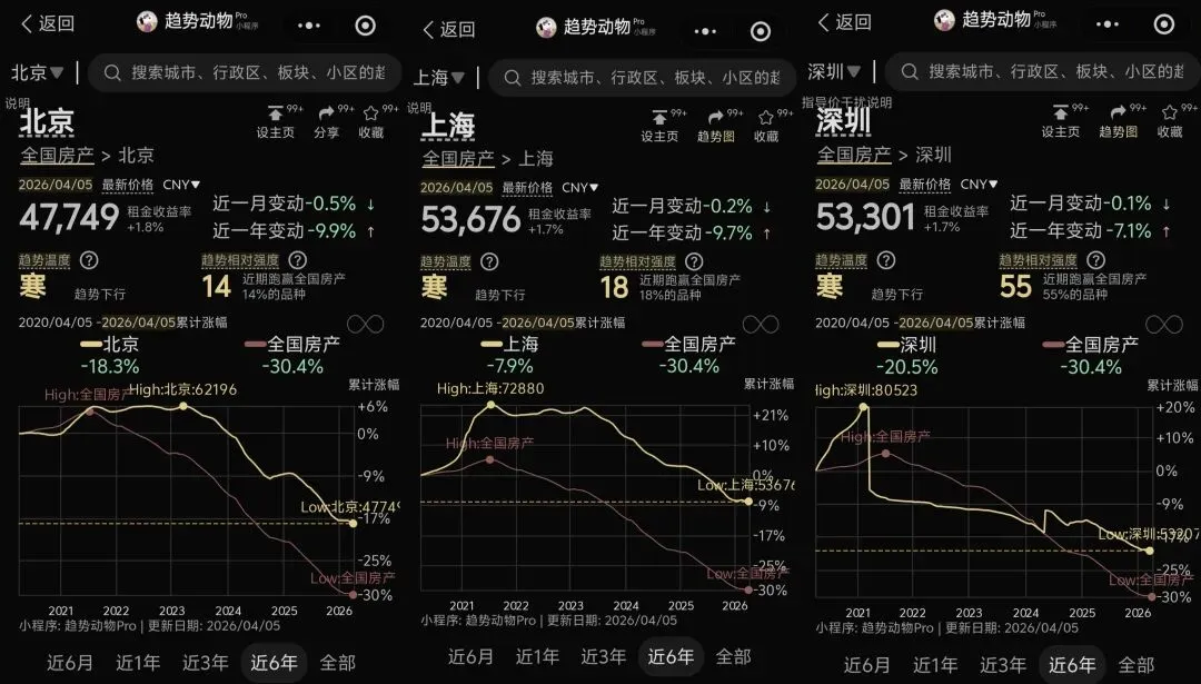 房子从2021年高点开始下跌,至今已经有5年了。下图我从某知名小程序上查的北上深房产价格趋势图。