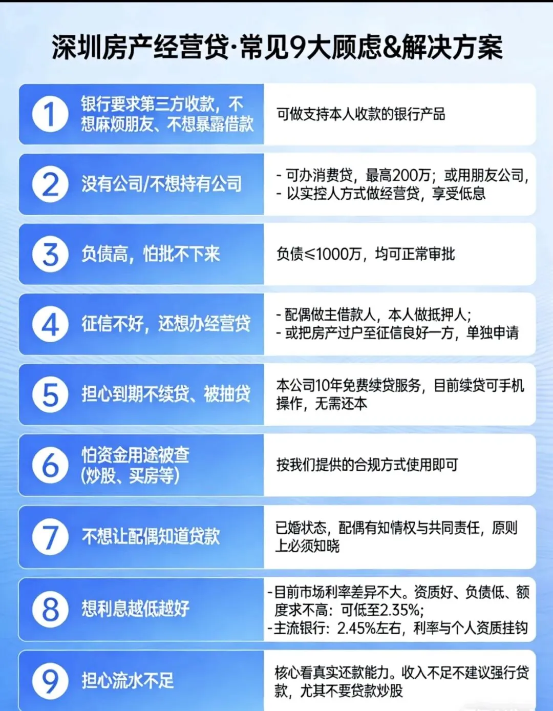 业主在做经营贷之前,先要了解深圳抵押经营贷市场基本行情,比如目前主流利率年限.额度成数等。