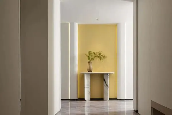 这一天,上海的天空里,晴空舒朗,白云漂浮,蓝天白云的映衬下,让人心情愉悦,也对于这次的探访充满了期待了。来到了上海市徐汇区的滨江区域,在饱览了滨江两岸的美景之后,踏入了Joyce的新家了。轻轻叩响大门,Joyce轻快地为我们开门了。在进入家的那一刹那间,一处色彩明亮的玄关就引入视线范围之内了。玄关,它将家的空间,从外部的公共,与家内部的私密相连接,它的重要性也无需多言了。设计师Bea以淡米色的墙面,与米色的地板作为主导,在玄关尽头,以一抹黄色的亮色作为墙面,以一张简洁的大理石桌子作为主导,上面放置了一盆新鲜的绿植,将整个玄关都营造出了清新雅致的气韵来。这一处澹雅的玄关,在色彩上,跳脱了米色的沉寂,将空间缔造出了淡雅又具有活力的象征。每天清晨,Joyce就是从这里,迈向了全新的一天,这雅致的玄关,也为她的看似平常的生活里,注入了隆重且典雅的生活仪式感,仪式不单在身,仪式更加在心了。