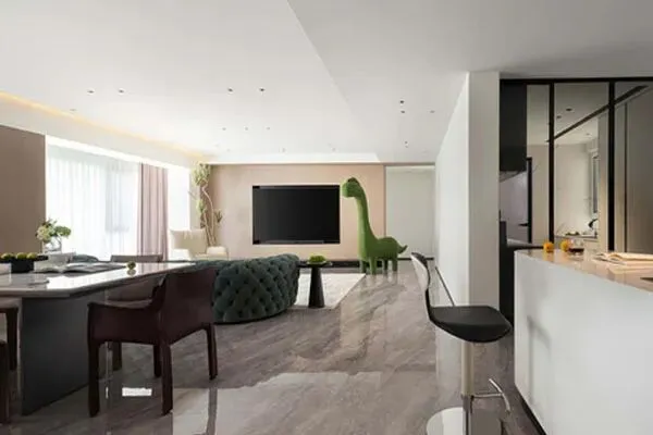 从玄关处,顺着洄游流利的动线,步入了家的内部。然而,就在家空间里落脚的那一刻,强烈感到了一股明媚澄明的气韵。俯仰抬头之间,望见的是家里一面宽阔的落地窗了。窗前无一物,窗内有闲情。这窗户,让人与天地同框,这窗户,让人与日月同生,这窗户,让人观黄浦江的潮起潮落了。当这曼妙的光影,徐徐而入的时候,仿佛这家的空间里也峯境自开了。在柔美的光线里,家也被温暖的阳光所加持,空间也被这一缕暖阳所关照了。光影粼粼之间,让人不自觉感到了光影行走的路径,也让人不得不感悟到光影游移的魅力所在了。在这个宽大的空间里,光它犹如一位身姿摇曳的舞者,用它自己的身体,在空间里肆意丈量着,也以它柔软的身躯,去慰藉了家空间的精美感。这阳光,它为家的温馨质感留下了一段痕迹了。如勒柯布西耶所说:“空间是呈现光的舞台。”Joyce的家就印证了这句话了。