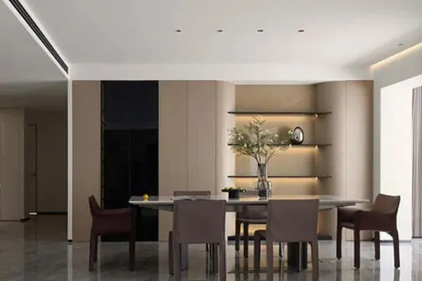 首先,Joyce带领我们来到了她最喜爱的空间:餐厅。Joyce时常在这里招待自己的朋友。她是一个爱聚会的人。设计师Bea在这间面积不小的餐厅里,颇费了一番巧思。一张长方形的纹理均衡的大理石餐桌,与六张深棕色的皮革餐椅,与一面温润原木的边柜,一同勾绘出了端庄典雅的用餐画卷了。值得提及的是,这张餐桌,以精湛卓绝的传统工艺打磨,让人欣喜地发现传统工艺的精致感,也深入对话了传统工艺的精神,也让人领悟到了传统在现代家居生活里的温度感。而餐桌上的高级餐具,与一盆活力满满的绿植,让餐厅空间里,平添了些许的高雅感。这间餐厅,在质朴之间,不失优雅,在素净之中,不乏灵韵了。当人们在此,觥筹交错的时候,他们也在此乐享着城市生活的千滋百味,这简雅的餐厅也抒写了家的舒适感。