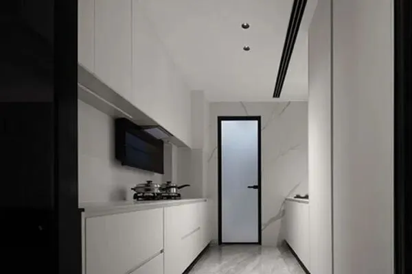 移步到了厨房空间。厨房的面积不算很大,但设计师Bea也在此将匠心注入了。在将这间厨房以一字型展开,白色依旧是它的主色调,在将考究的橱柜,光亮的灶具,与澹雅的饰面的结合之中,描摹出了一处结构典雅,功能齐全的厨房了。走人其中,不感到丝毫的拥挤感,有的是一应俱全的便捷与便利感。厨房,它一半人间烟火,一半诗意烂漫。无论你来自五湖四海,你也终将囿于厨房与爱了。设计师Bea在个有限的天地里,将设计的精致展现得淋漓尽致了。家的温暖就在这烟火之地,被娓娓叙述了。