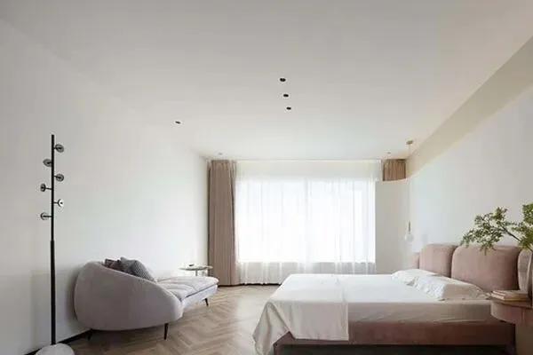 步履不停,来到了卧室空间。在推门进入的时候,我们仿佛就对于它一见钟情了。设计师Bea将舒展尔雅的床,与温雅柔美的原木鱼骨拼接地板,相互映衬。卧室空间里,没有多余的坠饰,没有过分的矫饰,没有过多的铺陈,有的是一股灵韵所在了。我们可以试想,当Joyce回到卧室的时候,也是她静心休憩的时刻了。在这间温厚的卧室里,每一夜都能酣然入梦,每一夜都能消解疲劳,让人循环纳新,重获新生了。这间卧室,不落窠臼,也让人久处不厌,在阅家无数的设计师Bea看来,这间卧室它可以可持续发展,为这个家留下了浓墨重彩的一笔,一笔也点睛了。卧室,它不止场域,它不止情韵,它是家里最为静谧的空间了。