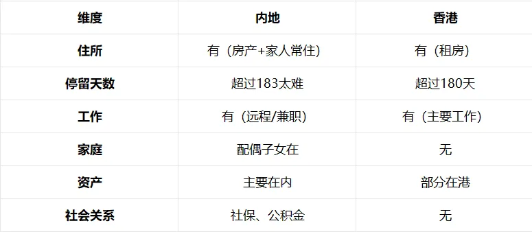重要利益中心:家庭、主要资产、社会关系都在内地 → 判定为内地税收居民