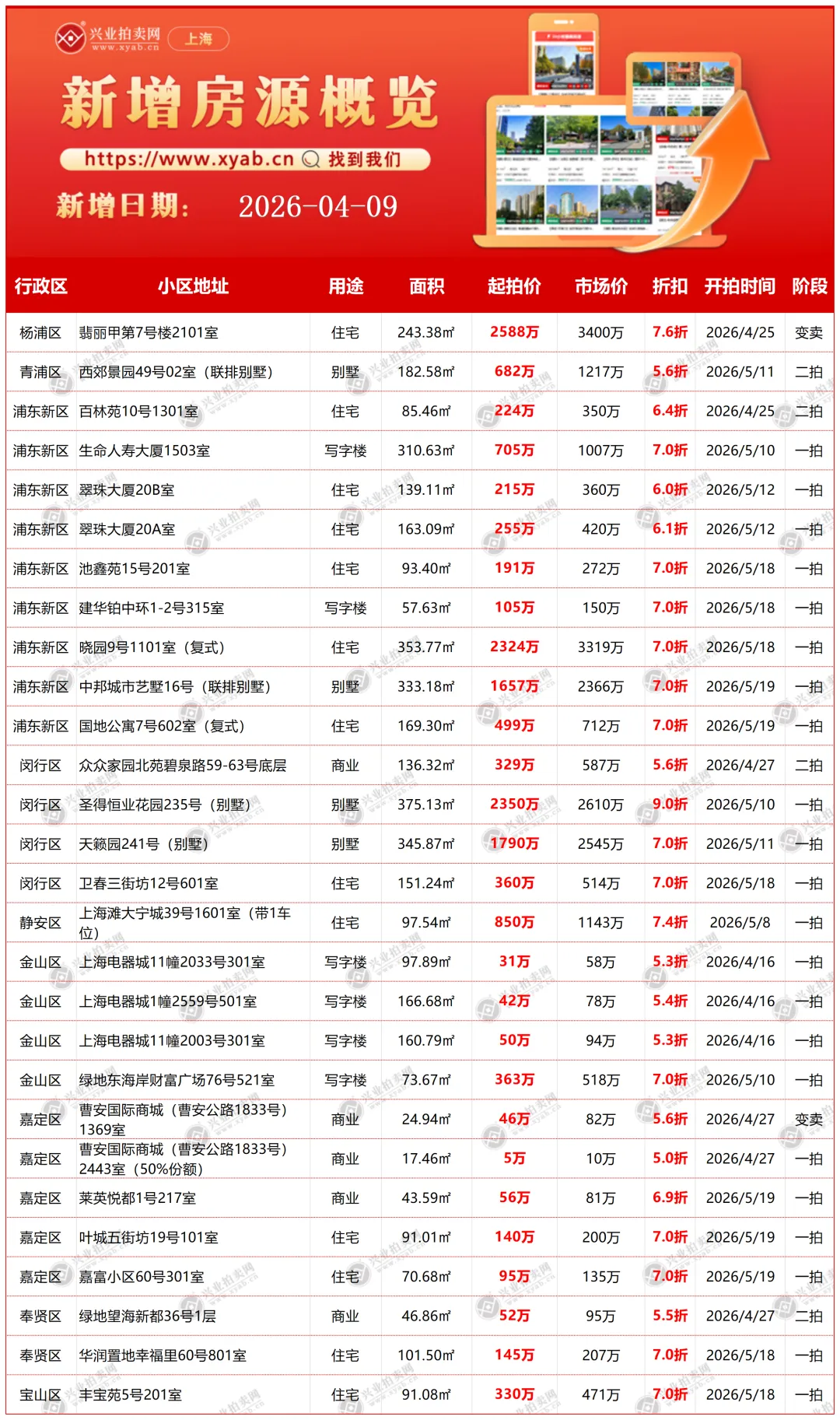 上海拍卖房产昨日新增详情