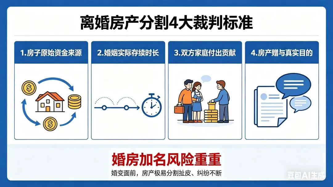 婚前房产婚后加名,是婚恋里极其常见的财产操作,也因此爆发无数离婚分割纠纷。法院判决分割比例,从来不是看房产证名字,而是综合多重维度全面裁量: