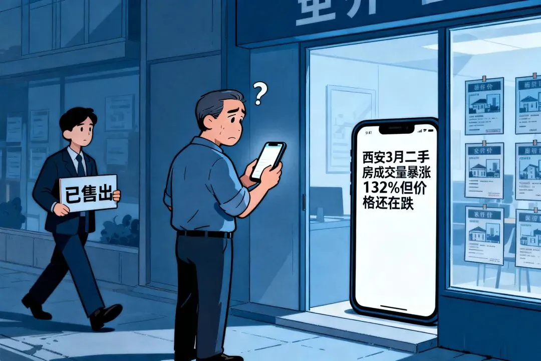 这个数字一出来,整个中介圈都在转发,配文是四个字——"市场回暖"。你是不是也心动了?想着终于熬到头了,房价是不是要涨回来了?是不是该等等再卖,能多卖点?醒醒。真实的情况是:回暖是真回暖,但你家房子卖不上价,也是真卖不上价。数据不会骗人。3月成交量环比暴涨132%,但西安二手房挂牌均价——环比还在跌2.29%,同比跌了9.64%。这就是今天这篇文章要戳的痛点:你的房子,正在这场"回暖"里,悄悄被贱卖了。
