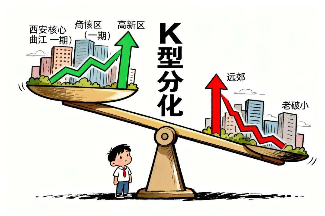 还有一件事,你必须知道——西安二手房市场,已经进入了严重的K型分化。曲江一期:均价约21,248元/㎡,3月逆势涨了2.1%。核心地段,产业+学区+稀缺性三重支撑,房价就是能扛。高新区核心:均价约17,034元/㎡,软件新城等产业聚集区抗跌。国际港务区:奥体+名校分校,均价稳定在1.5到1.7万/㎡。曲江二期:部分盘跌幅超过15%,前期价格透支严重。高陵、周至等远郊:部分楼盘从1.2万/㎡跌到不足6,000,近乎腰斩。老破小、无配套房源:议价空间15%到20%,挂了半年卖不掉,连中介都懒得推。如果你在核心地段,你的焦虑是"还能不能再多卖点";如果你在远郊或者产品竞争力弱,你的焦虑是——"再不割肉,可能连割肉的机会都没有了"。