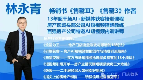 《AI引爆获客》,由地产畅销书《售罄③》系列作者、拥有超千场实战房产新媒体培训经验的林永青老师亲授,完全基于房产经纪人的真实工作流设计。我们不谈虚的,只教你能立刻上手、用了就有效果的AI获客全流程。--- 课程特色 ---