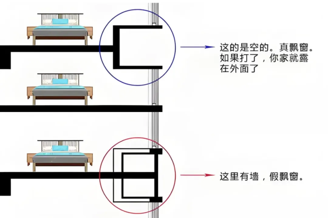 这里补充一点,新规里的真飘窗是指长隆悦府那种真的800mm宽,下面是挑空的飘窗,跟以往的二手房一样,打是肯定打不掉的了,最多外立面给你拿格栅挡一下这个空当。
