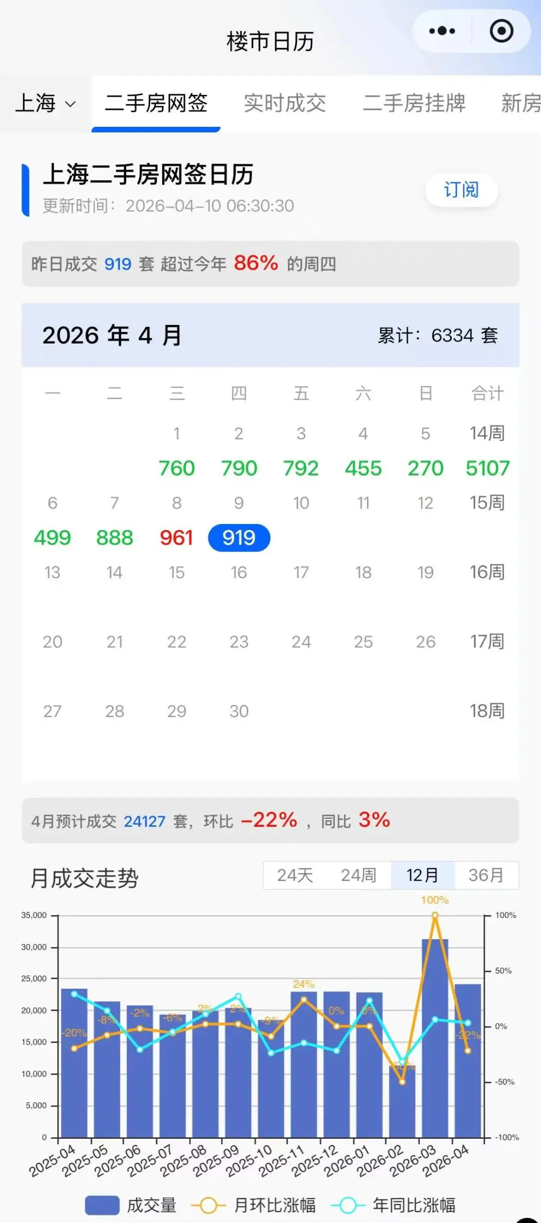 从最新的网签数据看,上海楼市的热度依然在线。昨天(4月9日)网签高达919套,超过了今年86%的周四,工作日的成交爆发力依然惊人。