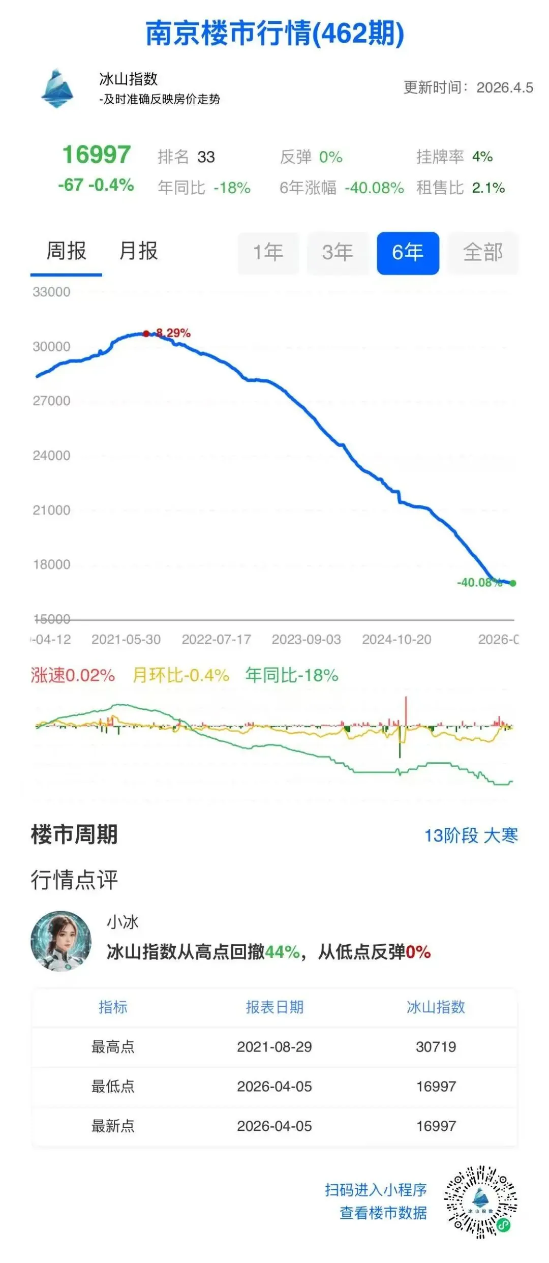 最新的冰山指数显示,南京房价已跌至16997元,与2021年8月的高点(30719元)相比,回撤幅度高达44%,几乎腰斩。