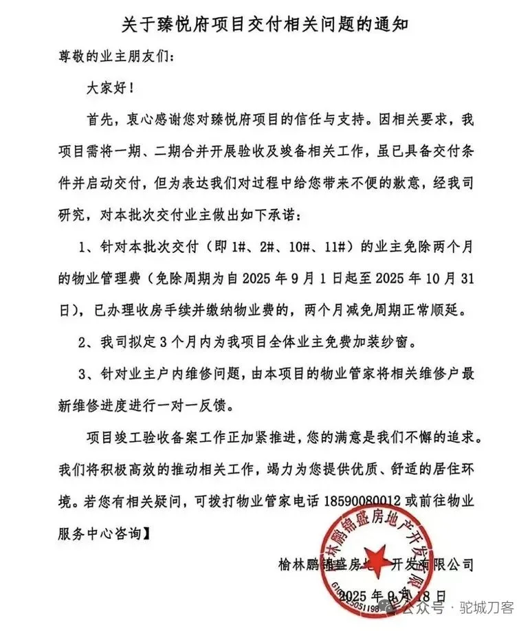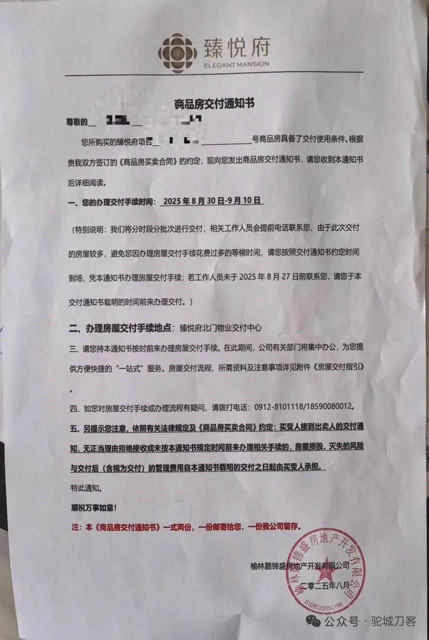 臻悦府小区由榆林鹏锦盛房地产开发有限公司开发,法定代表人钱嘉,项目分两期交付,一期合同交房日期2025年8月30日,二期交房日期2025年12月30日。截至目前项目仍未通过政府验收,未取得建设工程竣工验收备案证明文件、未取得房屋测绘报告,无法向业主提供《竣工验收备案表》,《住宅质量保证书》,《住宅使用说明书》,五方竣工验收报告、工程质量监督报告等核心文件,违反相关法律规定,开发商涉嫌违法违规交房。