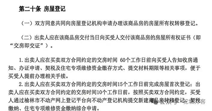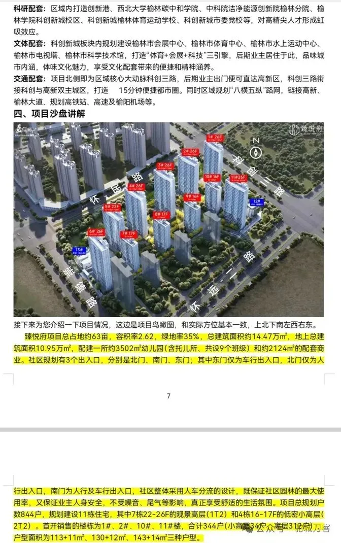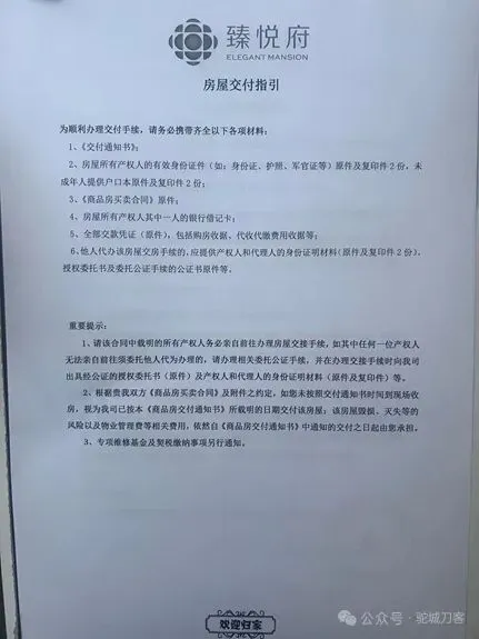 (这是2025年9月18日发布的正在推进项目竣工验收备案工作,至今仍未通过。)(臻悦府置业顾问经理刘志坤向一期业主回复25年12月30日具备接房条件)(开发商鹏锦盛臻悦府项目部在书面答复上回复臻悦府计划在2026年4月30日验收通过,获取竣工备案文件,具备交付条件。公司层面未做出任何回复,仅项目部发了一个态度不明确的回复,毫无可信度,严重侵害了全体业主的权益)二、违反交房即交证的约定根据开发商与全体业成主签订的商品房买卖合同第八章第二十条约定,出卖人应在商品房交付当日向买受人交付房屋所有权证书(即“交房即交证”)。开发商至今未提供不动产权属登记相关材料,协助业主办理产权证。 目前,小区部分一期业主由于开发商没有通过政府验收,证件不齐全,依法依规没有接房;一部分业主提前接了房;还有一部分业主在二期合同交房日开始接房。但在接房的过程中,物业公司要求支付从通知接房之日起算的物业费,并出现不交钱物业扣押钥匙的行为。 根据《物业管理条例》第41条:未交付给业主的物业,物业费由建设单位(开发商)承担。榆林市物业服务收费管理实施细则(试行)第三章第十三条:物业住宅小区内的房屋和车位经竣工验收后,符合交付条件的,物业服务费从建设单位书面通知业主办理交付手续截止日期的次日起由业主交纳。停车服务费从合同约定的交付时间次日起由业主交纳。房屋和车位已竣工但不符合交付条件的,或者因建设单位原因未按时交付给物业买受人的,其物业服务费和停车服务费由建设单位全额交纳。由于开发商没有合法交房,一期二期业主无义务支付自通知之日至房屋验收合格和房屋质量整改完毕接房期间的物业费和车位管理费。(见房屋交付指引重要提示2)四、违约金赔付问题臻悦府一期的合同交付日期是2025年8月30日,二期的合同交付日期是2025年12月30日,由于开发商无法提供法律规定的相关证件(三书一表等),无法合法合规交付房子,导致逾期交付,产生违约金。根据双方签订的商品房买卖合同第十二条逾期交付责任约定:(1)逾期在_90_日之内(该期限应当不多于第八条第1(1)项中的期限),自第十一条约定的交付期限届满之次日起至实际交付之日止,出卖人按日计算向买受人支付全部房价款万分之_0.1的违约金(该违约金比率应当不低于第八条第1(1)项中的比率)。(2)逾期超过_90_日(该期限应当与本条第(1)项中的期限相同)后,买受人有权解除合同。买受人解除合同的,应当书面通知出卖人。出卖人应当自解除合同通知送达之日起15日内退还买受人已付全部房款(含已付贷款部分),并自买受人付款之日起,按照4.2%(不低于中国人民银行公布的同期贷款基准利率)计算给付利息;同时,出卖人按照全部房价款的0.1%向买受人支付违约金买受人要求继续履行合同的,合同继续履行,出卖人按日计算向买受人支付全部房价款万分之_0.1(该比率应当不低于本条第1(1)项中的比率)的违约金。开发商应该履行合约,向业主赔付合同交房日至取得竣工应收备案、合法交房日期间产生的违约金。五、房屋质量问题未整改到位1.部分房屋水管破裂,严重漏水,墙壁反碱,吊顶有水渍;2.部分房屋出现墙体裂缝;墙纸后立面,墙固不均匀,腻子质量差,揭开墙纸腻子即脱落;3.墙壁地面空鼓地方整体较多,吊顶阳角及墙面开裂整体较多;4.防水仅卫生间干区300mm,淋浴区1800mm,其余地方如客厅卧室厨房整体未做防水,厨房柜体和卫生间橱柜下无瓷砖;6.部分房屋卧室阳台小窗上玻璃无3C标识;7.卧室木门内里为密度板材质;8.厨房卫生间均为石膏板吊顶;9.其它。业主曾与开发商交涉,要求整改房屋质量问题,很多问题至今未整改。六、宣传与建设不一致问题1、地库东门出入口,销售时接待说辞和示意图均体现为双向车道,实际为单向入。臻悦府地下车库有1000多车位,属于大型车库,按《车库建筑设计规范》(后简称《规范》)表4.2.6和表4.2.4的明确要求,应至少有两个车辆出入口,且每个出入口宽度应不小于7米,但臻悦府的的车库建设只有两个入口和一个出口,其中一个入口只有4.6米,与《规范》要求背离;宣传:实际情况:相关法规:2、113户型宣传无梁无柱,实际阳台处有梁,与样板间不符;宣传:实际情况:3、销售时,置业顾问声称85000元的车位比起80000元的加带充电桩,实际没有体现;宣传:实际情况:开发商对于上述问题不承认不解释不答复,甚至说谁说的去找谁。七、车库安全问题地下车库至今监控未全面覆盖,仅主干道有个别监控,在车辆停放期间发生的剐蹭、碰撞,应由谁来负责?物业收取车位管理费的目的是否仅为地库卫生清理和告知占位车辆驶离?车库南门下坡拐弯处(见图示蓝框)道路狭窄且有遮挡,在此会车易发生碰撞。车库通道(黄色箭头)汇入车行主干道(红色箭头)路口两侧有墙体遮挡,汇入车辆与主干道行驶车辆相遇易发生碰撞。